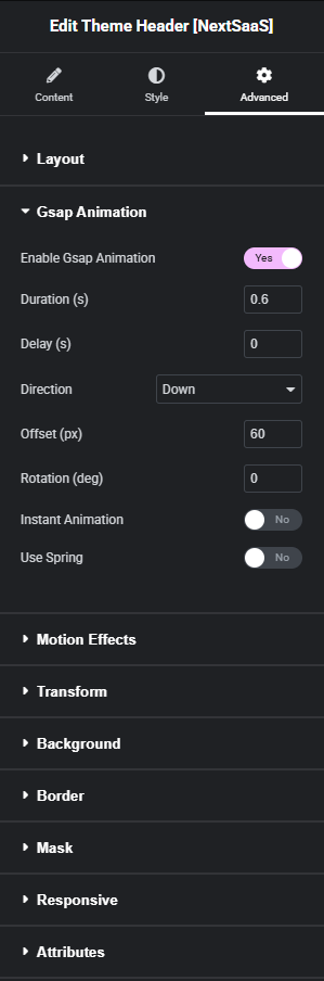 NextSaaS integrates GSAP animations directly into Elementor, giving you professional-grade animation capabilities without writing any code. You can apply animations to any widget, section, or column in your Elementor pages, headers, and footers.