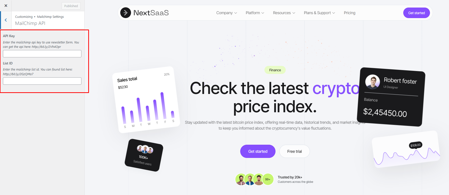 NextSaaS includes built-in MailChimp integration for newsletter subscriptions. This allows you to easily collect email addresses and manage your subscriber list directly through MailChimp. You just need to collect the MailChimp API key and List ID from your MailChimp account.