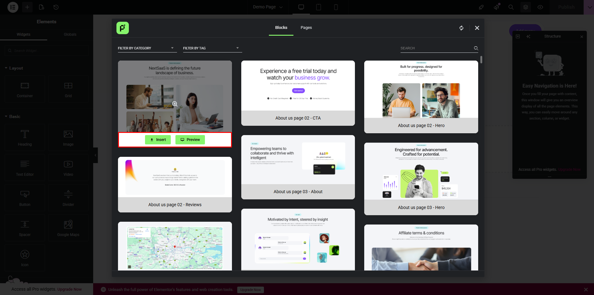 NextSaaS includes a comprehensive Template Library integrated directly into Elementor, giving you access to hundreds of professionally designed content blocks and complete page templates. This feature allows you to quickly build beautiful pages by inserting pre-designed sections instead of creating everything from scratch.